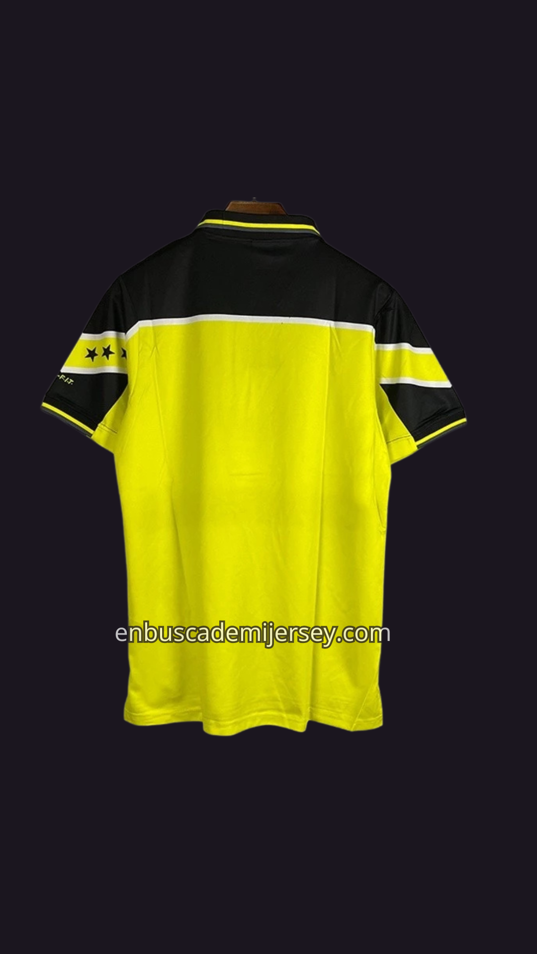 Este jersey local, con sus tonos amarillo eléctrico 🟡 y negro imponente ⚫, fue el manto de guerra que portaron los héroes que derribaron al poderoso Juventus. 🛡️⚡