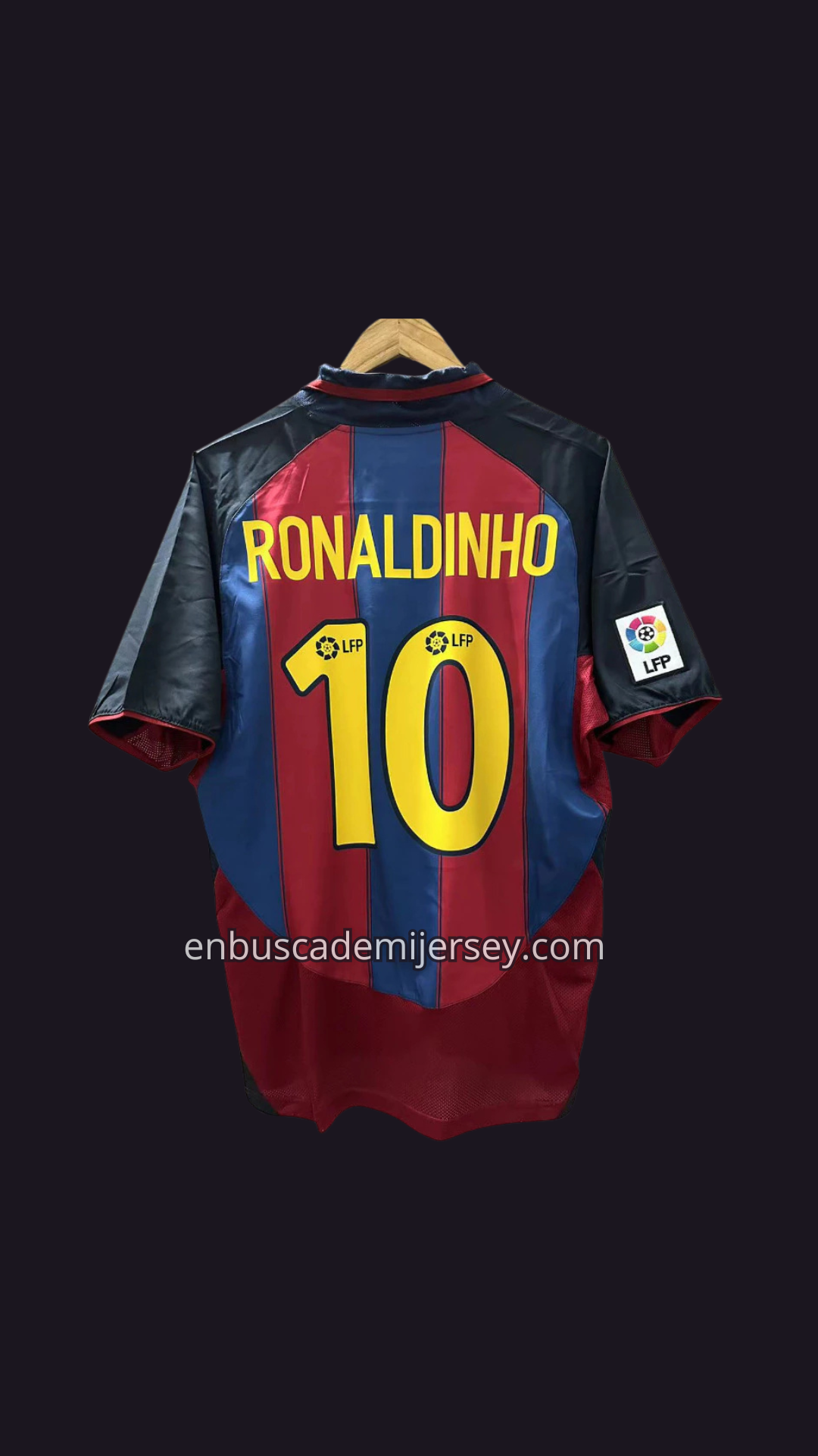 Esta camiseta azulgrana con franjas clásicas, escudo bordado y el icónico número 10,