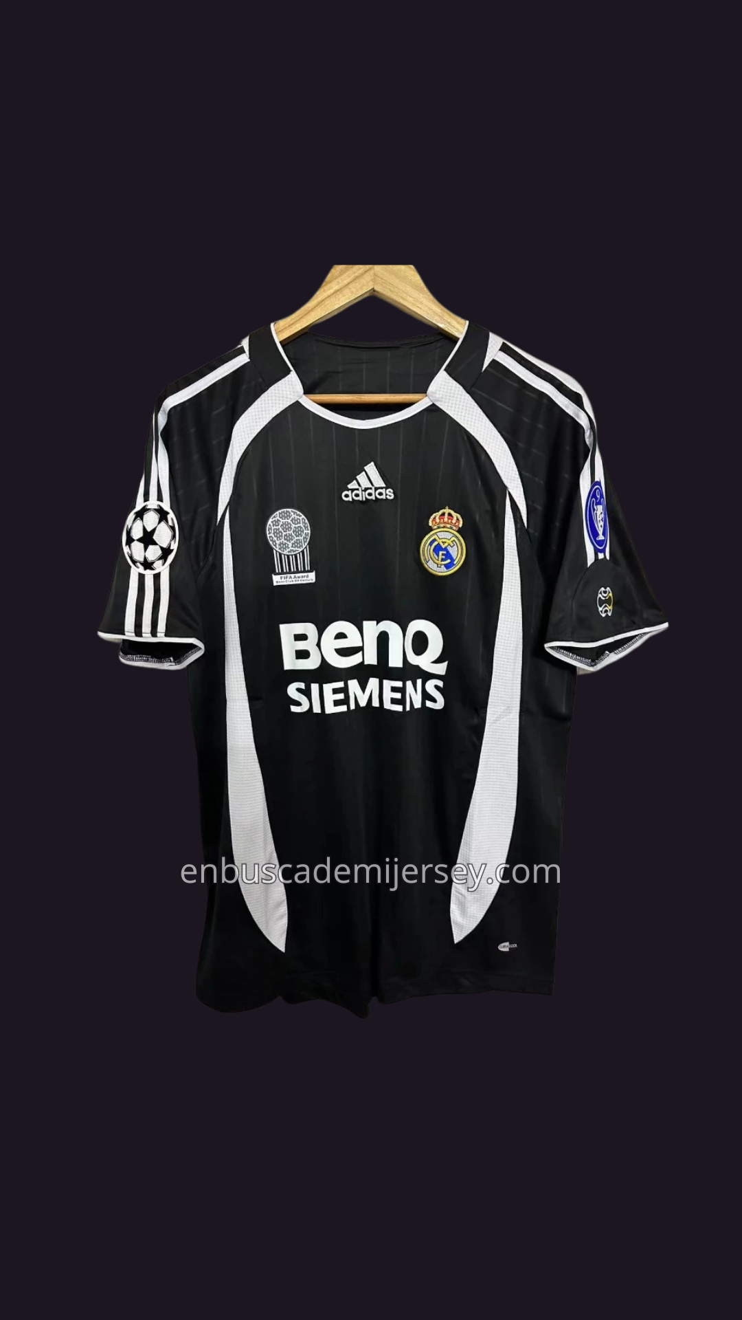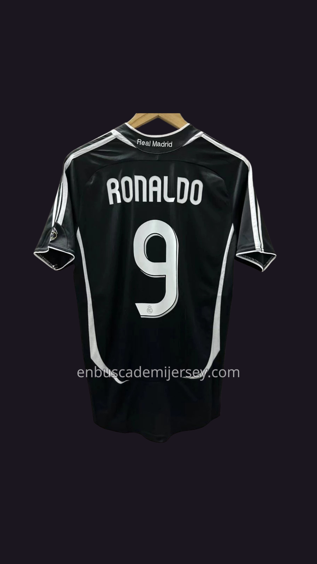👕 Este jersey de visita 2006-07, elegante en negro con detalles plateados y el escudo bordado, representa la última danza de Ronaldo con la camiseta merengue. ⚫🌟